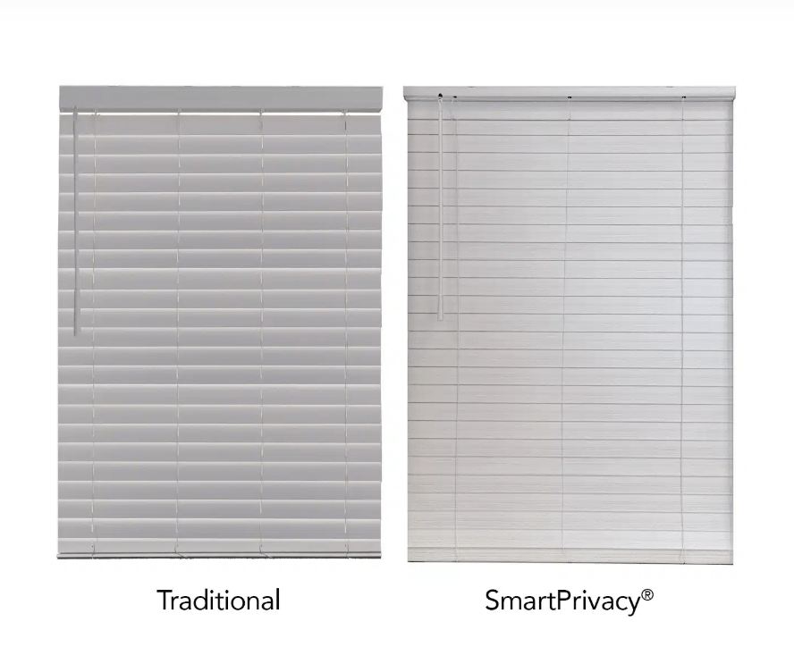 Our faux wood blinds’ integrated pivoting bottom rail turns 90 degrees when closed to align with the slats resulting in the tightest top and bottom closure.