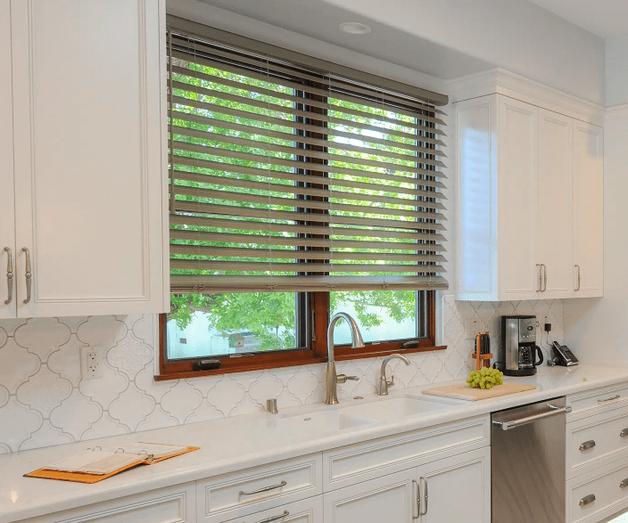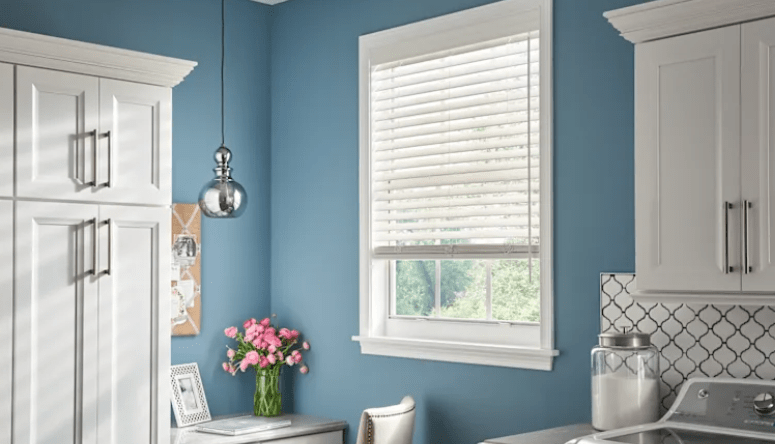 Faux Wood Blinds from Kentuckiana Window Elegance are designed to look like real wood, giving each room distinctive character and charm. Perfect for any room and especially for areas such as kitchens, laundry rooms, and bathrooms. Faux wood blinds resist moisture and are easy to clean.